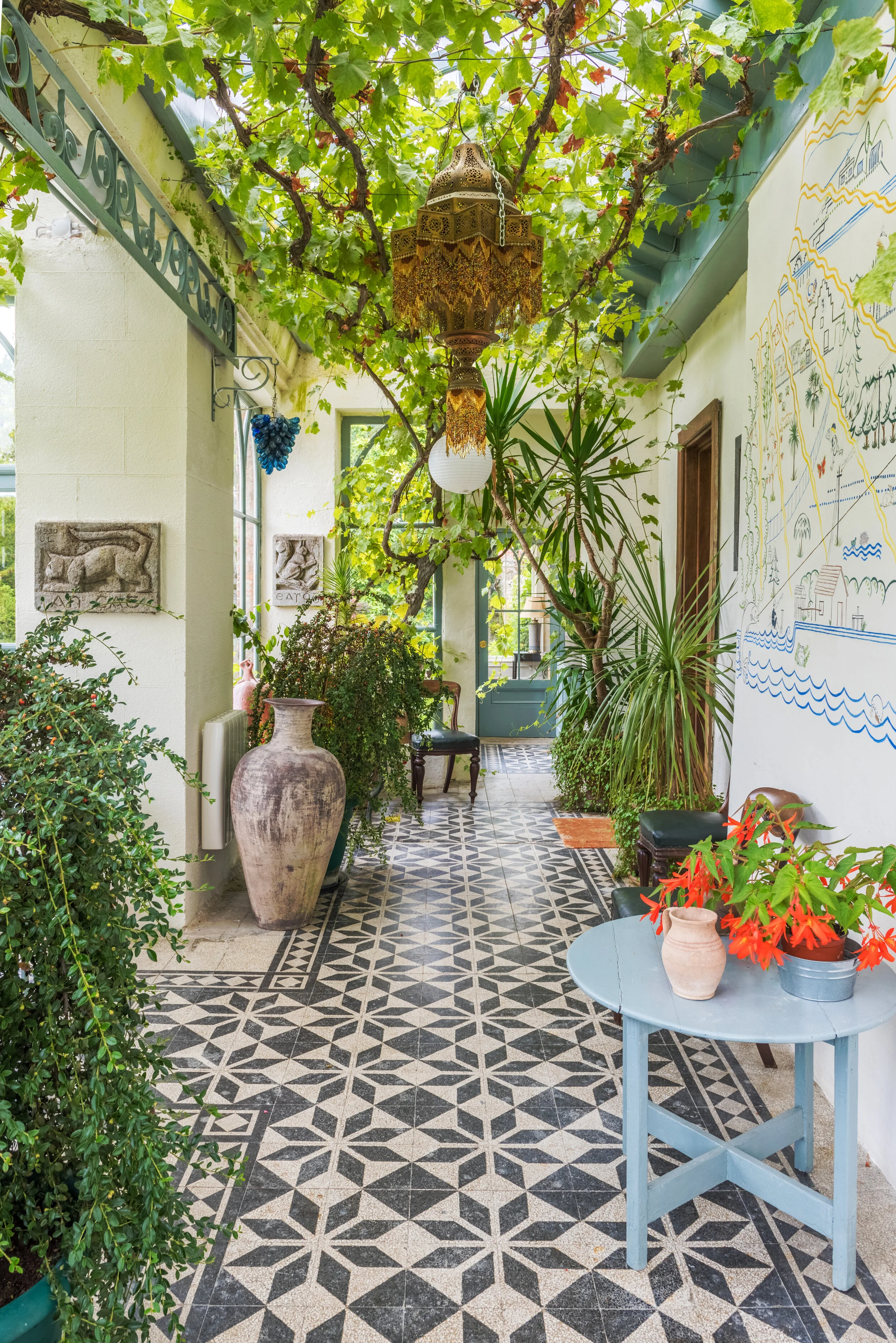 The conservatory features a magnificent grape vine forming the ceiling, a gift to Anne Boleyn, taken from Hampton Court Palace.